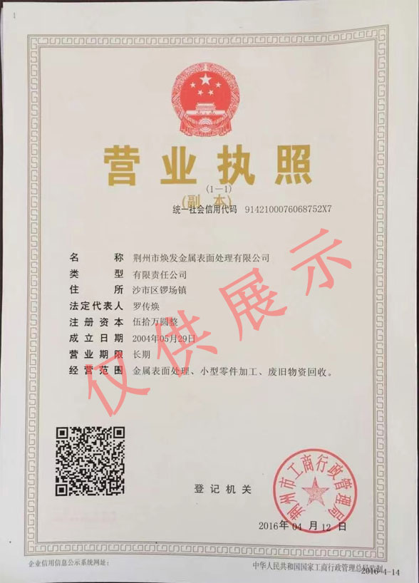我司創(chuàng)建于1998年,于2004年正式更名注冊(cè)為荊州市煥發(fā)金屬表面處理有限公司?,F(xiàn)占地面積27000平方米,北靠318國(guó)道,南抵漢宜高速公路,地理位置優(yōu)越,交通非常便利。我司主要從事金屬表面處理:三價(jià)鉻鍍鋅,鋅鎳合金鍍鋅,電泳漆,硬質(zhì)磷化,擠壓磷化,鋁合金陽(yáng)極氧化,達(dá)克羅等。我司是荊州市環(huán)保達(dá)標(biāo)企業(yè),是荊州市安監(jiān)部的驗(yàn)收合格達(dá)標(biāo)企業(yè),質(zhì)量管理體系分別通過(guò)了ISO9001:2008認(rèn)證和IATF16949:2016認(rèn)證。我司電鍍產(chǎn)品主要長(zhǎng)期配套供貨于上汽大眾、東風(fēng)公司、神龍公司、日立公司、博世公司等。
